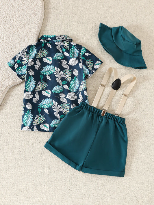 Baby boy spring and summer beach vacation set with maple leaf print top, short sleeves, shorts, hat, and belt – 4 pieces
