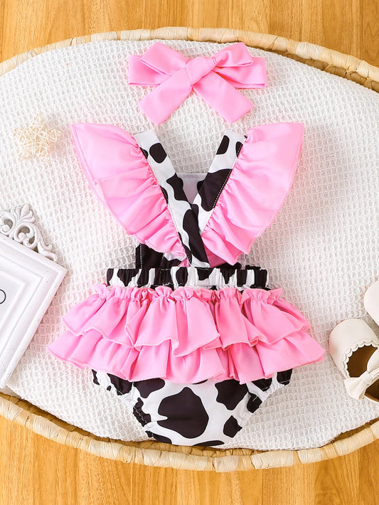 Baby Girl Cow Print Romper Set, Ruffled Sling Bodysuit with Pink Bow Headband, Cute Animal Infant Outfit