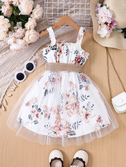 Girls' Spring and Summer Casual Fashion Woven Suspender Floral Print Mesh Dress with Belt
