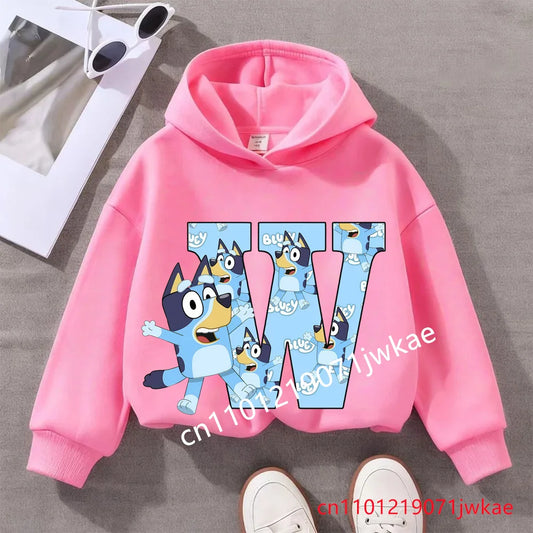 Kids Bluey Letter ABCD Pattern Printing Hooded Sweatshirt Fall Winter Warm Soft Pullover Comfortable Playwear for Boys Girls