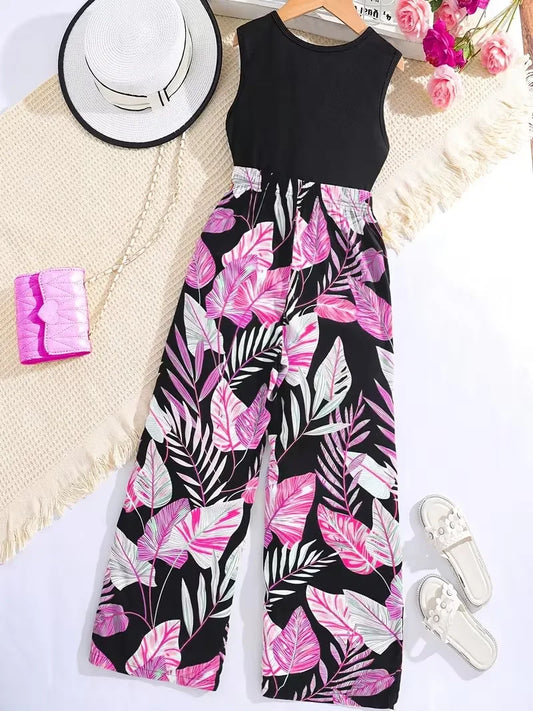Girls Tropical Jumpsuit – Black Sleeveless Top with Pink Leaf Print Wide Leg Pants Romper for Summer