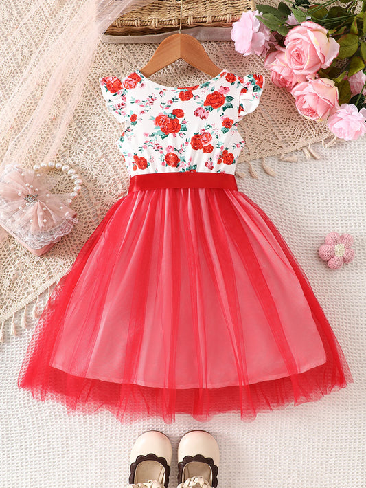 Girls' Spring and Summer Casual Fashion Knitted Round Neck Sleeveless Flutter Sleeve Ruffle Floral Print Mesh Dress Beach Vacation Party Gift
