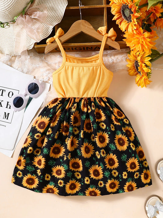 Girls' Spring and Summer Casual Fashion Knitted Suspender Dress with Bow and Sunflower Flowers