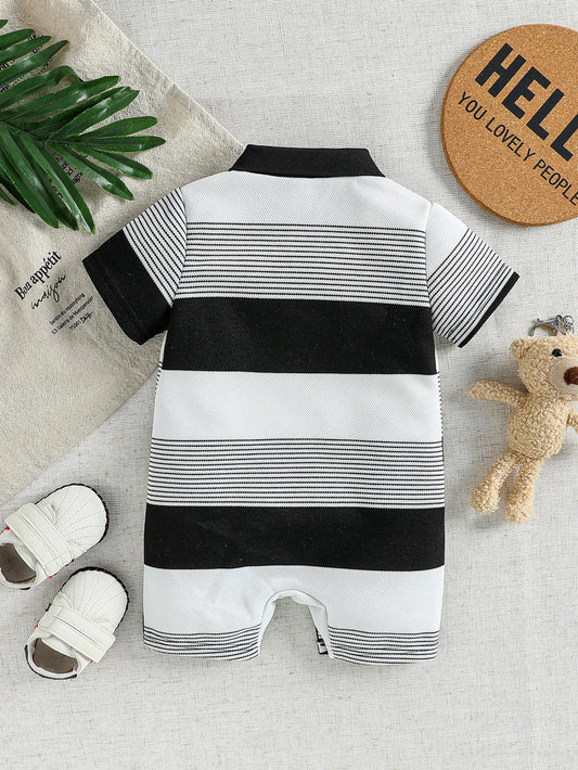 Baby Boys Cute Striped Summer Short Sleeve Turn-down Collar Bodysuit For 0-1Y Casual Daily Wear Romper