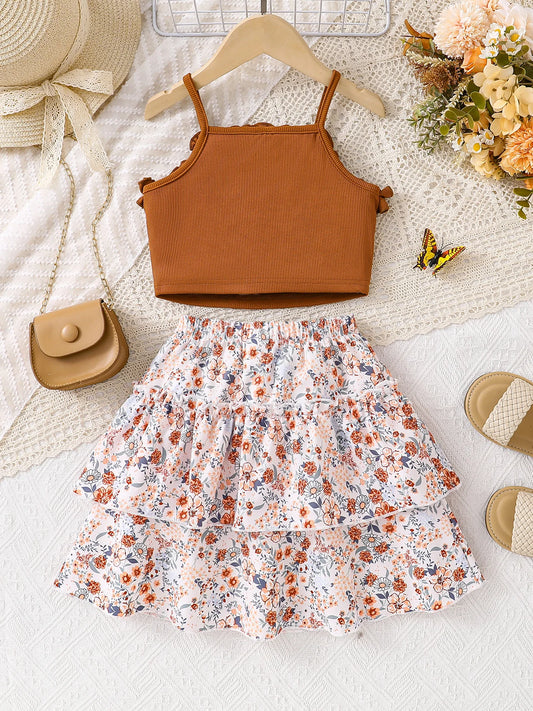 Spring Summer Girls Fashion Casual 2-piece dress Brown petal edge sleeveless vest + floral pleated cake knee-length skirt set